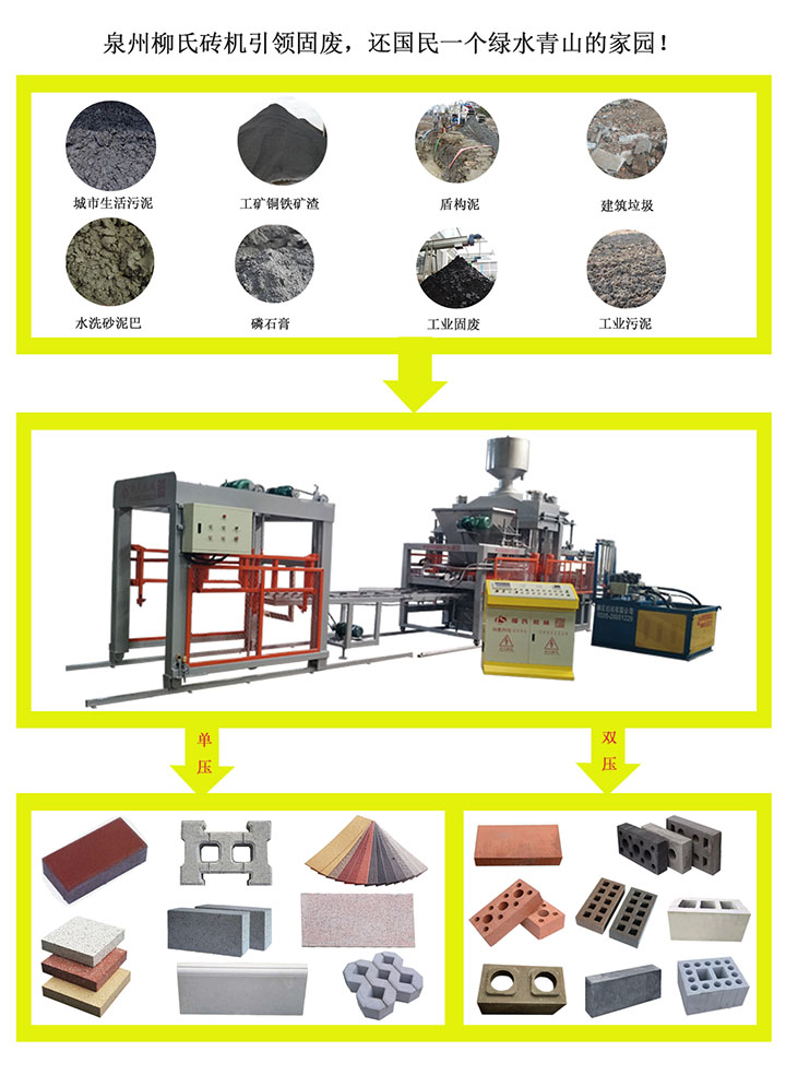 (3)固廢制磚,可以按材料性質(zhì)及配比來選擇不同的機型。一般含泥量比較高的就采用液壓磚機來生產(chǎn),含泥量不高的,首先免托板磚機,次之才選擇帶托板的水泥免燒磚機;當然了,有制作彩磚、路面磚的還是選擇單壓液壓磚機會好點!如果猶豫不定選擇什么類型的水泥免燒磚機的話,可以先咨詢?nèi)萘洗u機涂先生或者帶上制作原材料,來泉州柳氏磚機做個試驗!